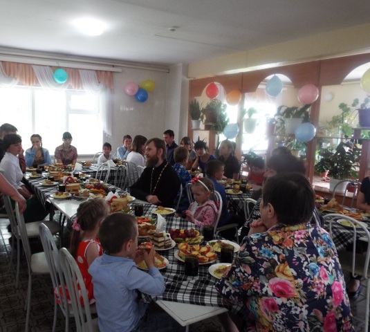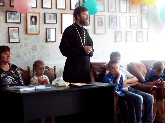 Настоятель Свято-Троицкой церкви Александр Жгунов тоже поздравил детей с праздником и вручил благодарственные грамоты за участие в приходской жизни педагогу Нечунаевой М.Ф. и её воспитанникам: Егорову Саше, Марковой Тамаре, Ильенко Светлане, Дёмину Руслану, Дёминой Ане, Полянских Лёне, Титову Денису. Додильная Н.И. поблагодарила детей за их участие в работе воскресной школы и вручила интересные детские книги.