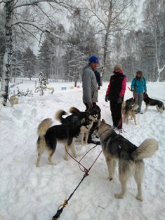 И вот катание на упряжках….. Собаки-хаски завораживали детей одним только видом! Красивые, статные, добродушные… Наперебой дети расспрашивали о жизни, содержании и уходе за собаками. С интересом слушали дети и о заслугах собаках, ведь совсем недавно заводчики собак вернулись из Новосибирска с медалями. Весёлым смехом и раскатистым лаем собак в этот деть наполнился лес! Счастью детей не было предела!