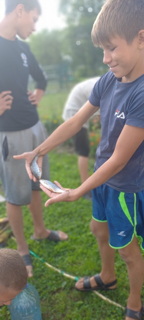 Прибыв к водоёму, они выбрали подходящее место, на котором разбили небольшой лагерь. Подготовили снасти, наживку и дело пошло. С увлечением рыбачили все!!! А вот и наш улов!!!